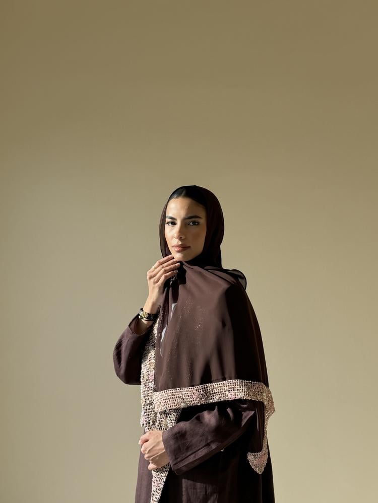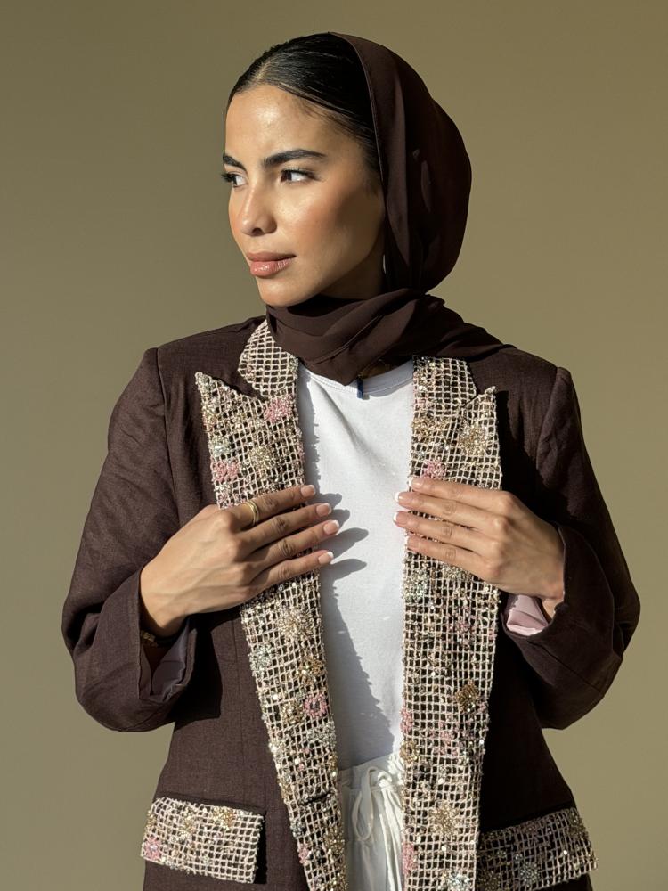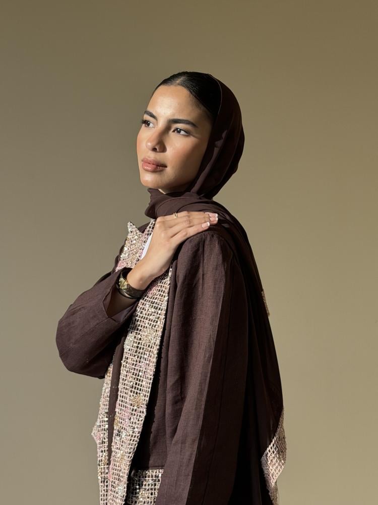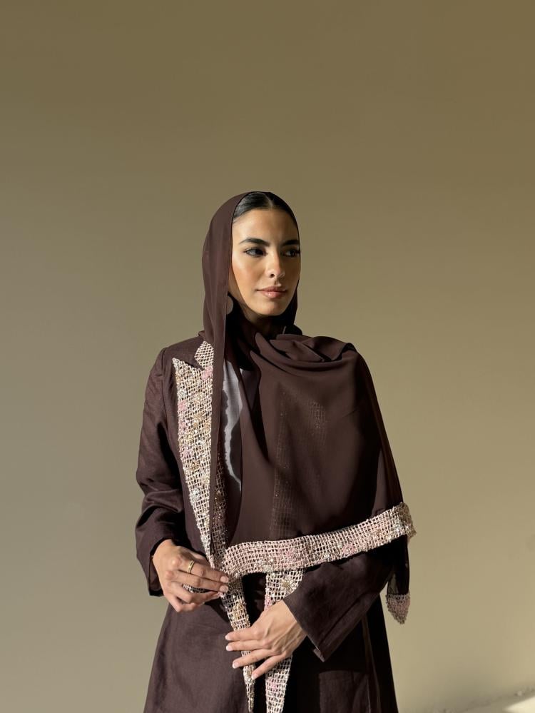 عبايه بليزر من قماش اللينن الايطالي مزينه بقماش شك من الامام وعلى الطرحه