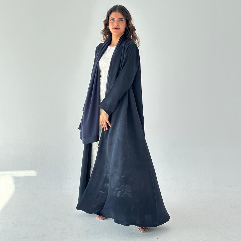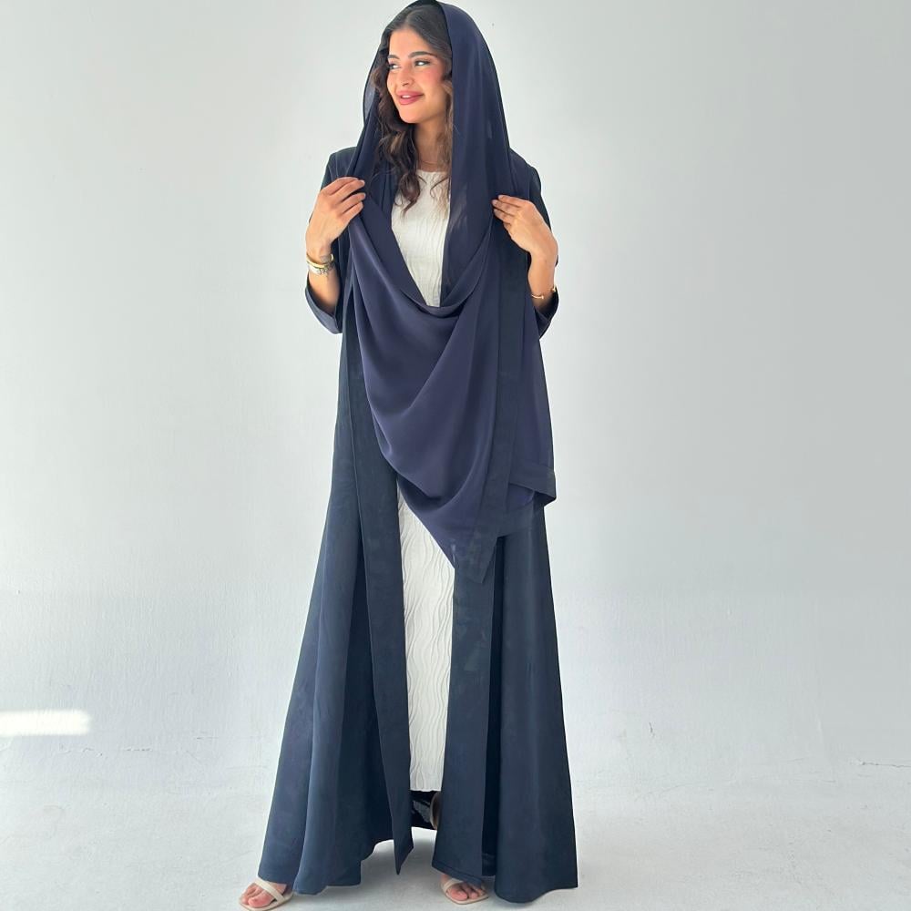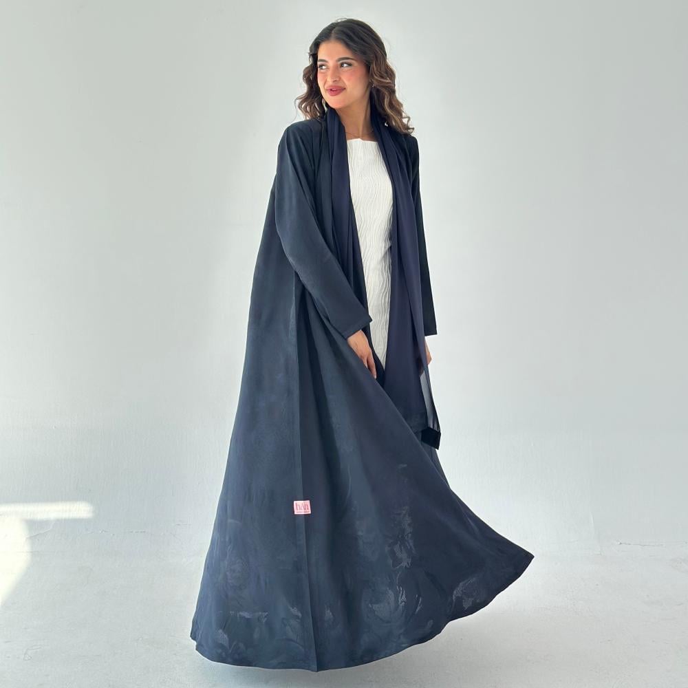 عبايه باللون الكحلي من قماش حرير الجاكار بقصة كلوش