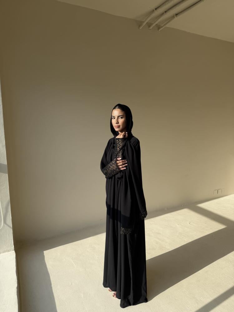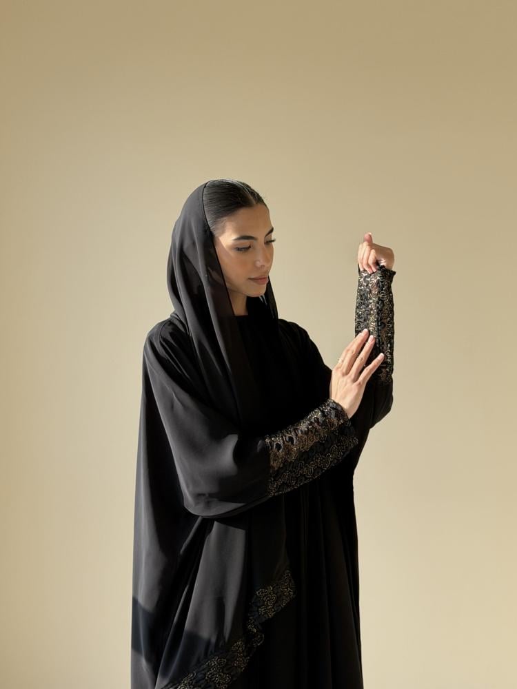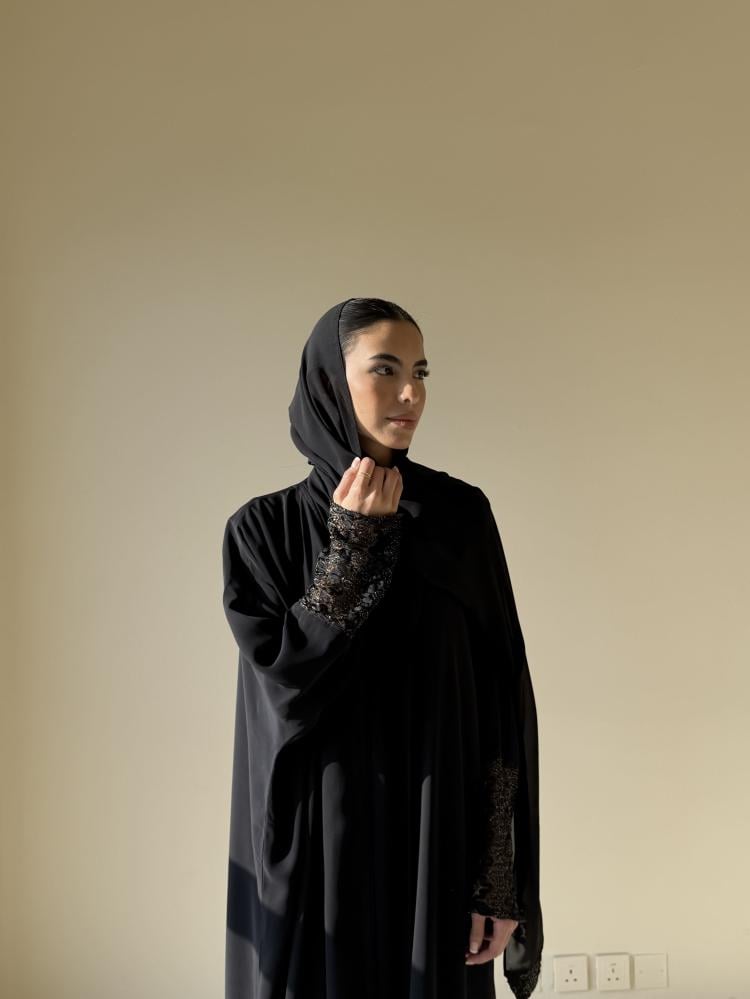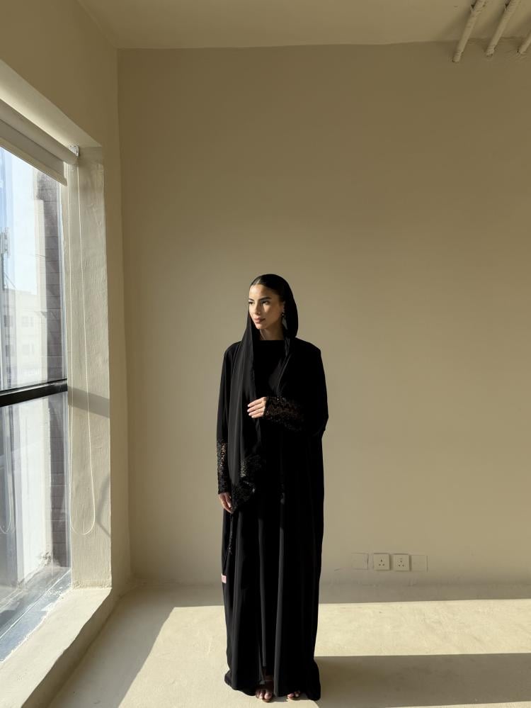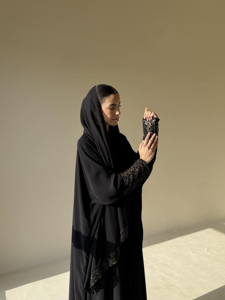 عبايه من قماش شيفون جاكار مبطن على الكم والطرحه