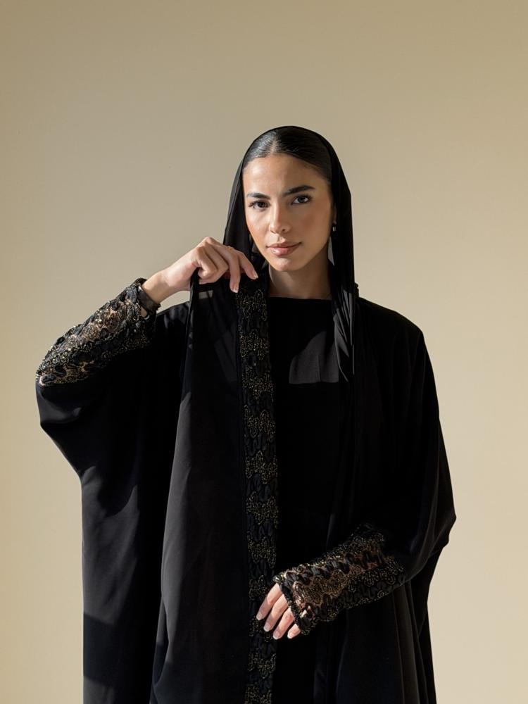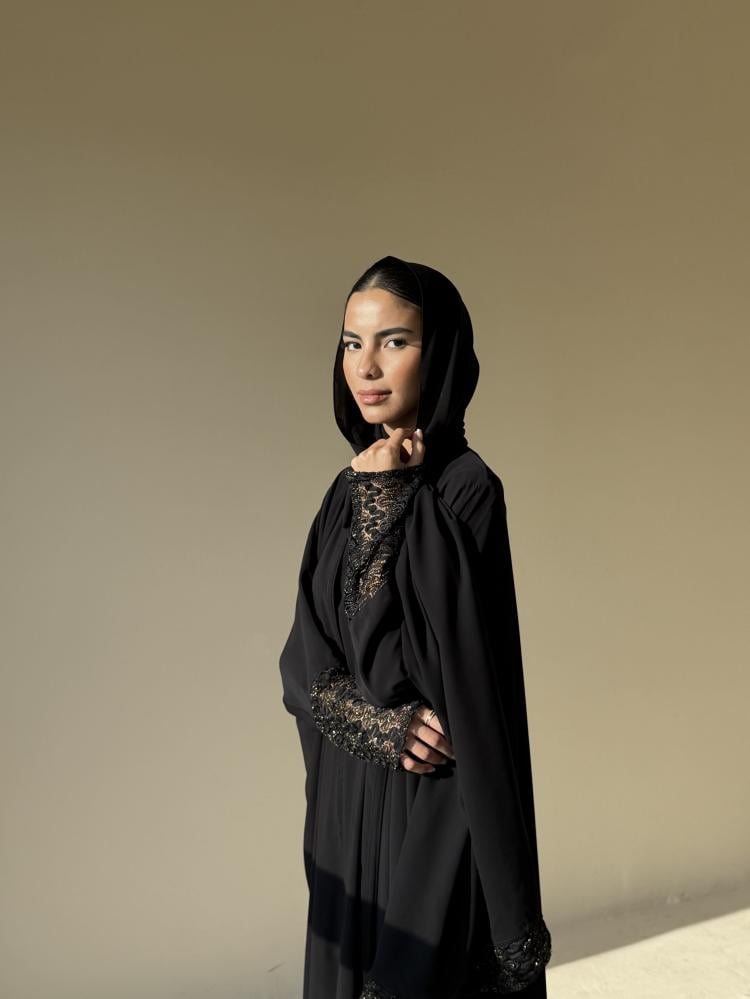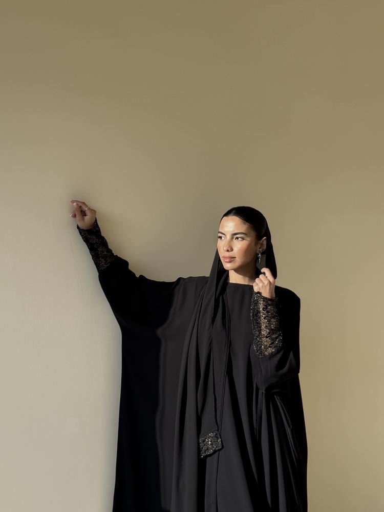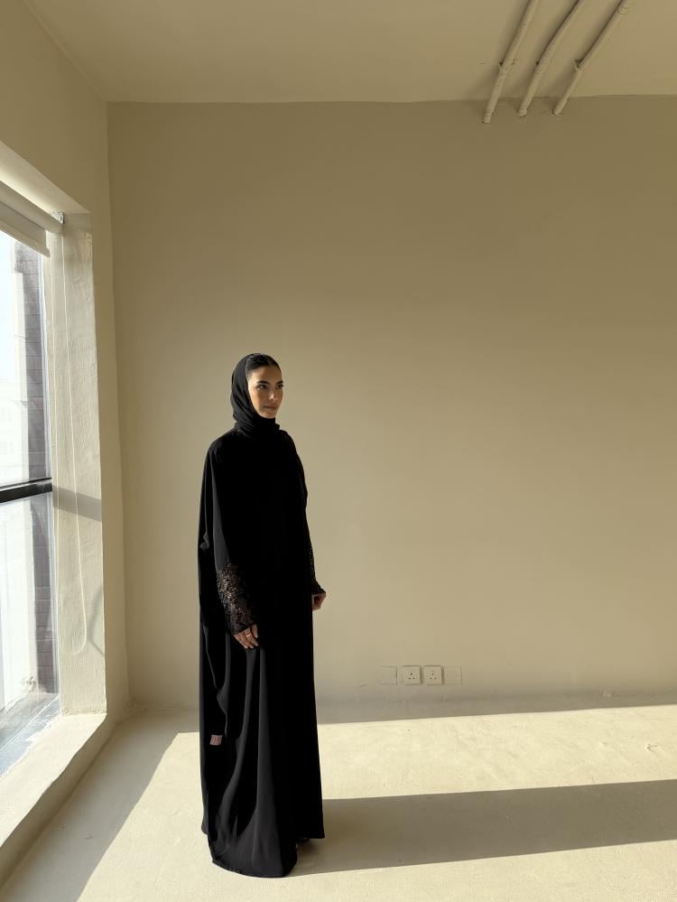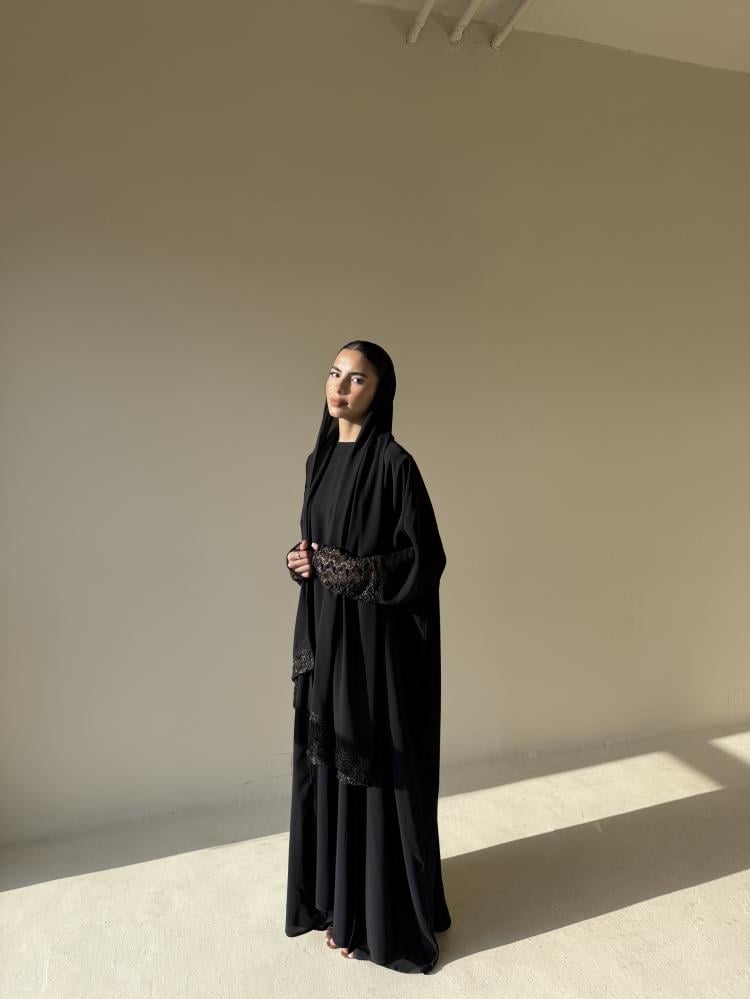 عبايه من قماش شيفون جاكار مبطن على الكم والطرحه
