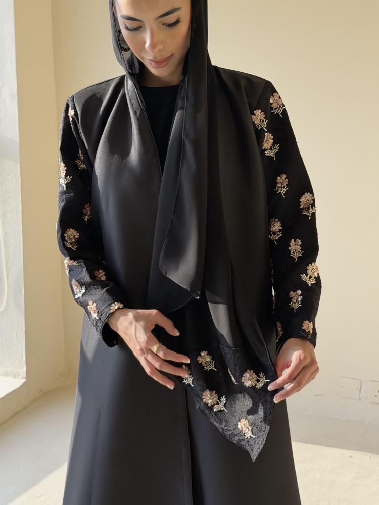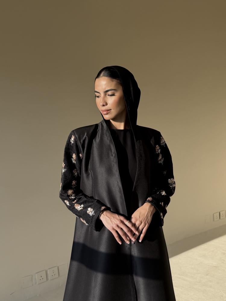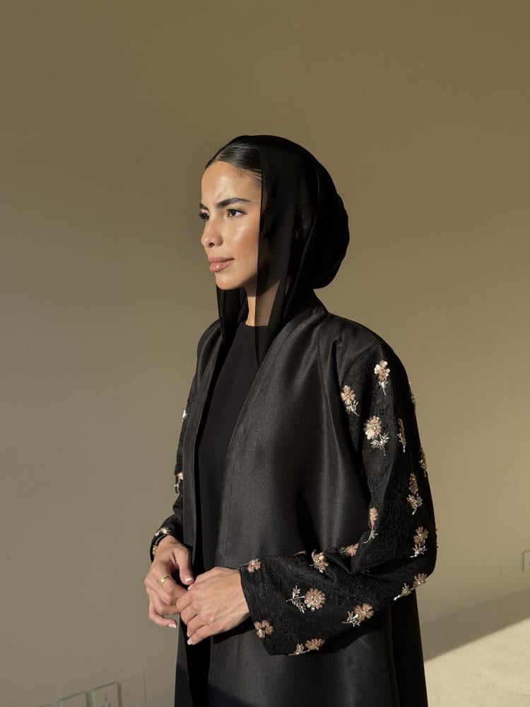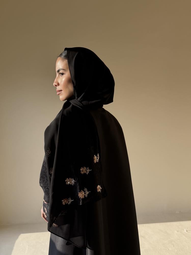 عبايه بقصة كلوش من قماش التفته مزينه من الاكمام وعلى الطرحه