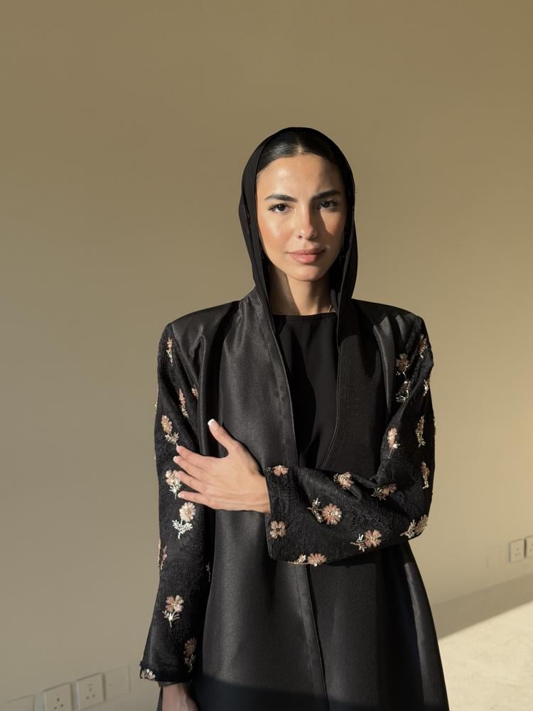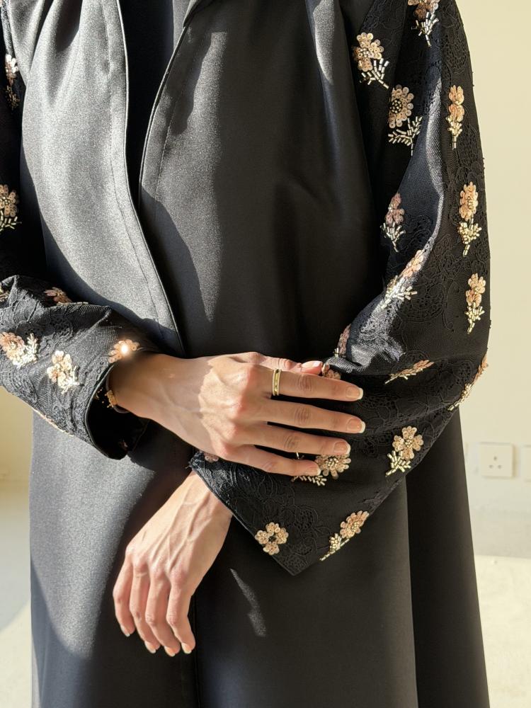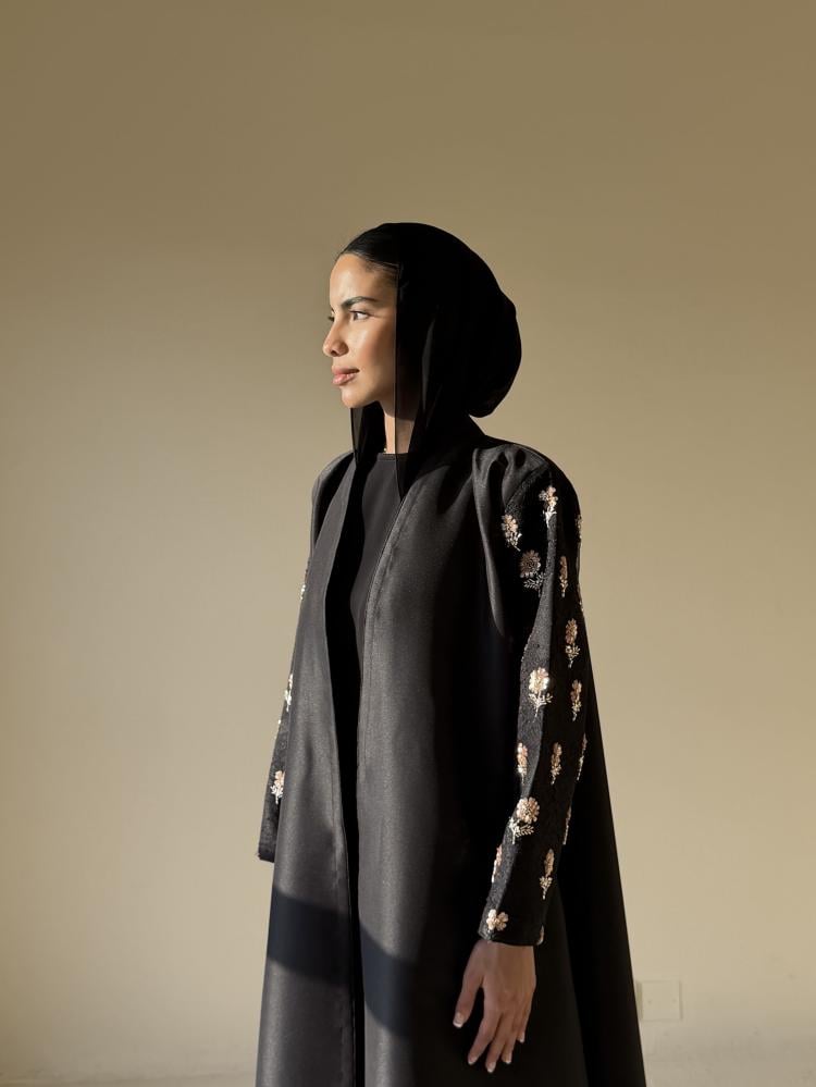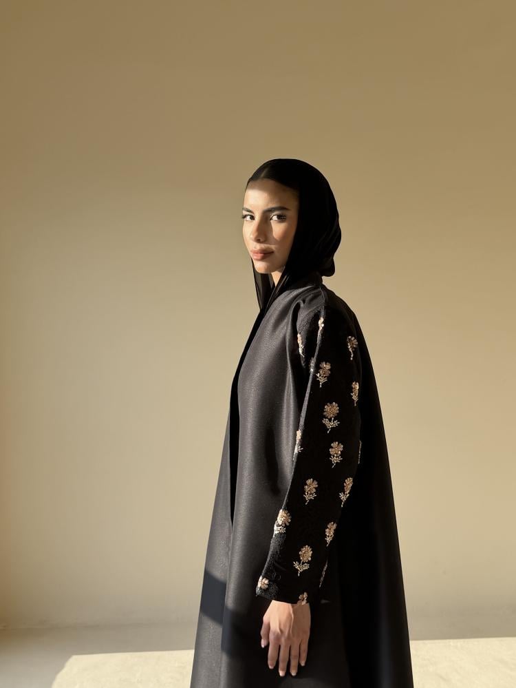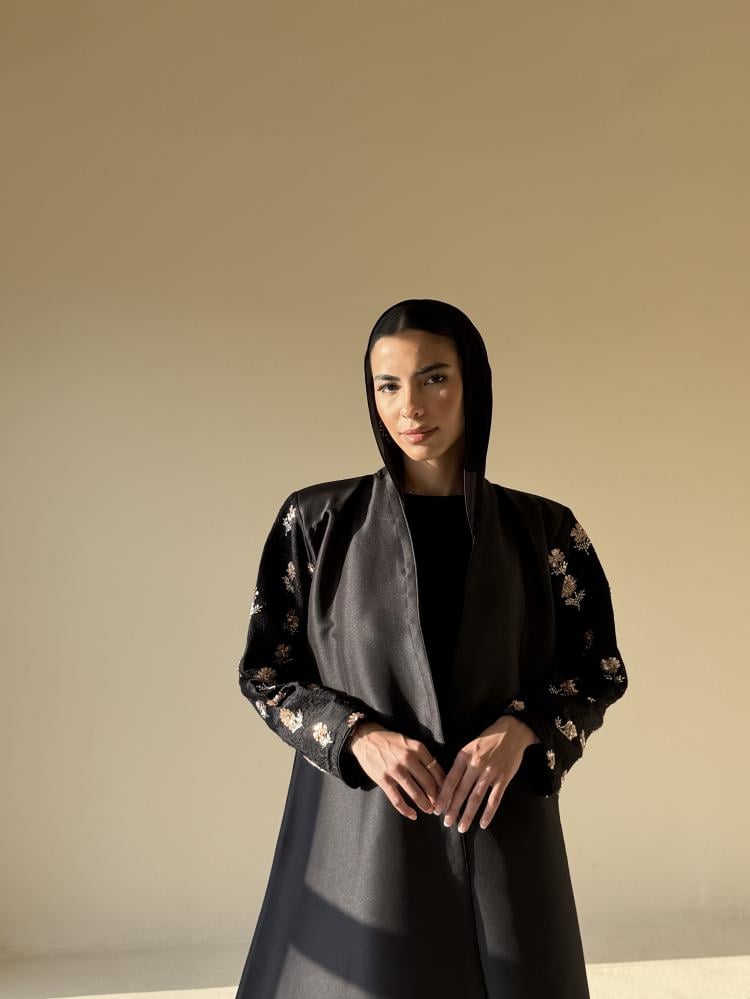 عبايه بقصة كلوش من قماش التفته مزينه من الاكمام وعلى الطرحه